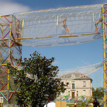 Entièrement constituée de cordages et de filets, notre cage à grimper est une structure d’escalade mobile qui s’adresse aux petits et aux grands. Les 6 grimpeurs simultanés crapahutent librement dans l’enchevêtrement de filets et de cordes, pour monter jusqu’à 8 mètres de hauteur !